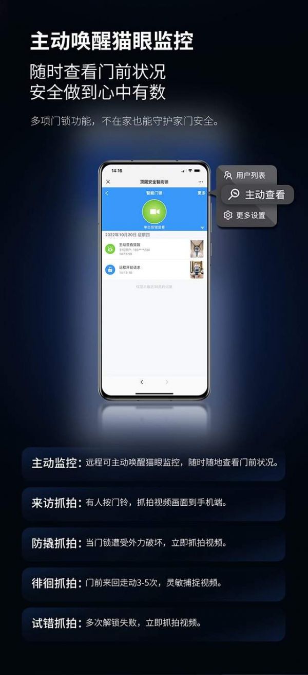 除此以外,这把锁的主动查看功能我一定要给各位独居女性强烈安利!它配置了一个190°超广角猫眼,摄录的视野可以媲美裸眼视觉,无论是从广度、还是清晰度,都能妥妥地给我们把家门状态显示出来了。更神奇的是,顶固TP10M掌静脉智能锁能够远程连接手机,在家不方便或者不敢开门,还能够通过手机主动查看功能,打开猫眼,看看门前状况和访客。如果平时不在家,亲朋好友到访,还可以通过远程猫眼查看,确认门前访客以后,远程手机解锁,迎接访客进门。