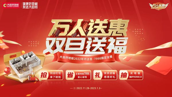 随着全国疫情逐渐放松,不仅加速家居产业的洗牌,快速实现优胜劣汰,也将为广大家居企业带来新一轮的品牌突围契机。大自然地板更是在12月谋篇布局,推出“万人送惠 双旦送福”全国营销活动,线上、线下花式营销火热进行中,全国主动出击抢订单、拓市场,为家居消费市场注入新的活力与生机。