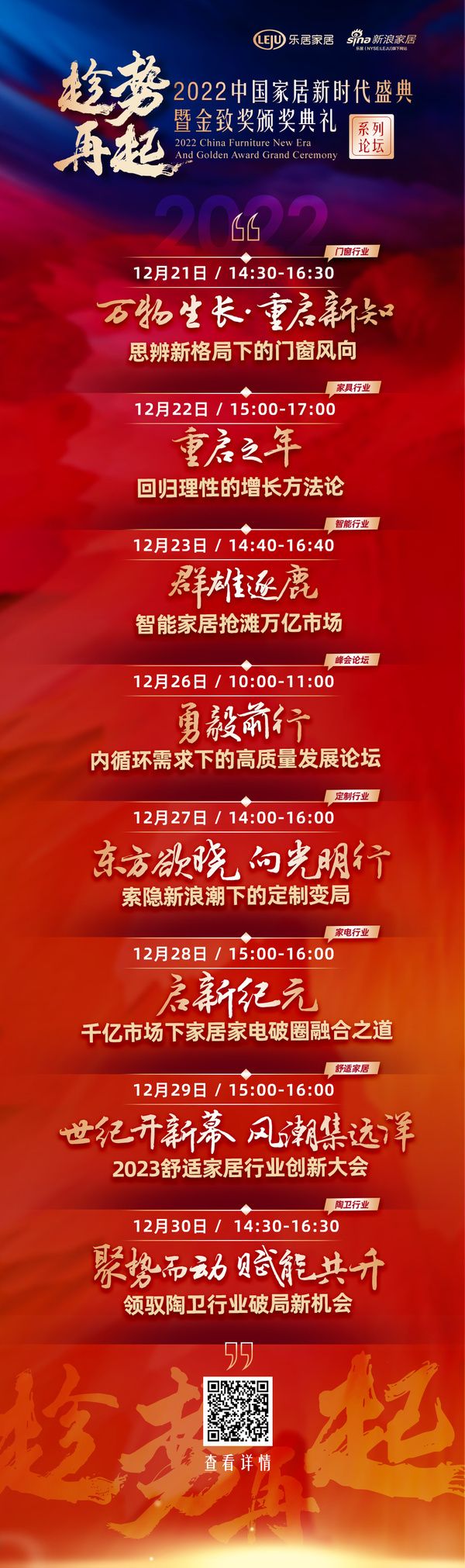 此外,从12月21日到12月30日,『趁势·再起——2022中国家居新时代盛典暨金致奖颁奖典礼』系列主题论坛也将陆续上线,行业涵盖陶卫、舒适、智能、家电、定制、门窗、家具等共计8场论坛,以细分品类市场现存痛点为核心展开,汇聚行业大咖,共同探究大环境下家居企业的高质量发展之路。