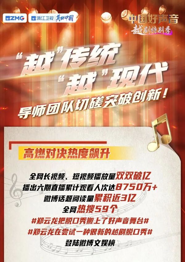中国文艺评论家协会副主席傅谨文艺点赞道:《中国好声音》是电视节目中的顶流,越剧是戏曲中最有观众缘的剧种之一,两相叠加,取得了超出预想的效果,短短几期节目长视频和短视频播放量就双双过亿。 节目切实挖掘并充分展现戏曲本身的意义与价值,显现戏曲的美感,绽放戏曲的魅力!