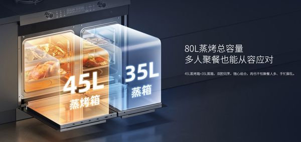 ①在一家多口,口味挑剔的情况下,45L蒸烤炸+35L蒸箱80L大容量组合,既能一次搞定全家人的菜又能满足不同的口味!