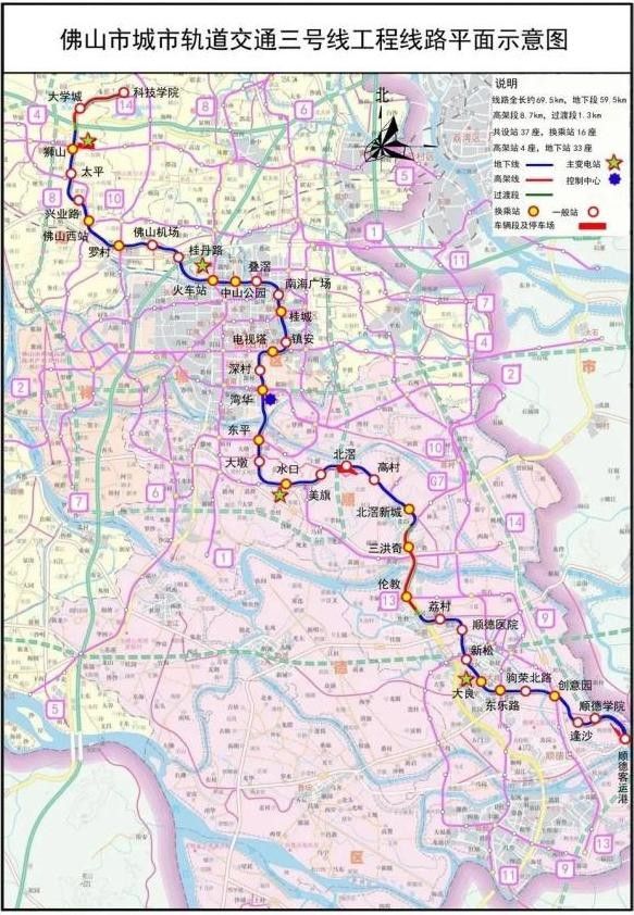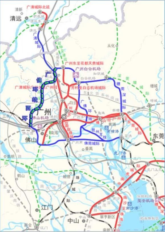 广佛环线--广佛西环(在建中):全线共设9站,除既有的广州北站、佛山西站外,新建狮山东、大榄、官窑南、和桂、炭步、花都港和神山7座车站,并在炭步设城际铁路职业训练段1处。建成后20分钟通达广州南,20分钟通达广州白云机场。