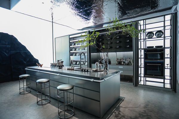 将竹子隐藏于门板的手抓纹烤漆上面,把竹节释放于导台四周的桅杆上。看似小小的变化,却延伸到了所有:空间,产品元素,产品形体,还有无形的精神文化。