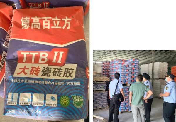 广州番禺工商查处1个山寨窝点,查扣山寨德高百立方瓷砖胶550包,包装袋460个。