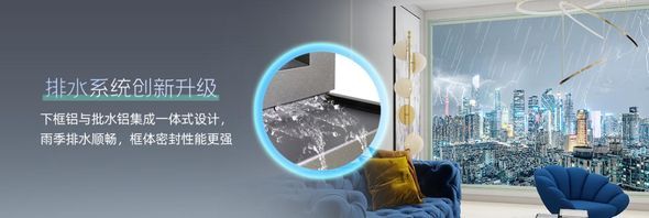 同时,它为了让防水效果更显著,还创新升级了排水系统,下框铝与批水铝集成一体式设计,使框体密封性能更强,雨季排水更顺畅,充分保障窗户的水密性,让家万无一“湿”。