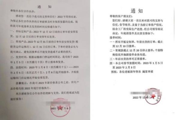 2023年春节是1月22日(大年三十),比2022年提前了10天,加之全国疫情反复影响,今年各行各业都提早发布了“停止接单”的通知,对经销商及客户做好下单和库存备货计划作出提醒。