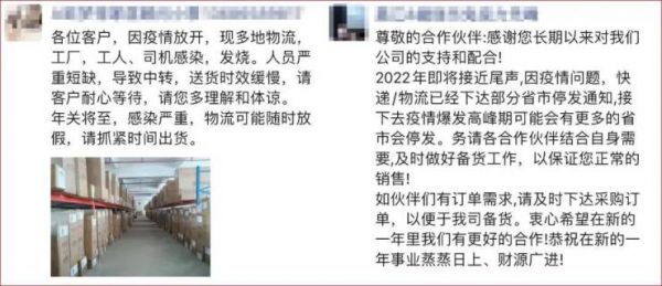 有厂家表示,元旦后发出的货物春节前不一定能到达,部分省份遇雨雪天气可能还会变动。有物流行业人指出,未来1-2个月各地迎来第一波疫情高峰期,严重地区的物流延误概率增大;同时,极端天气可能会影响部分地区的正常运输。