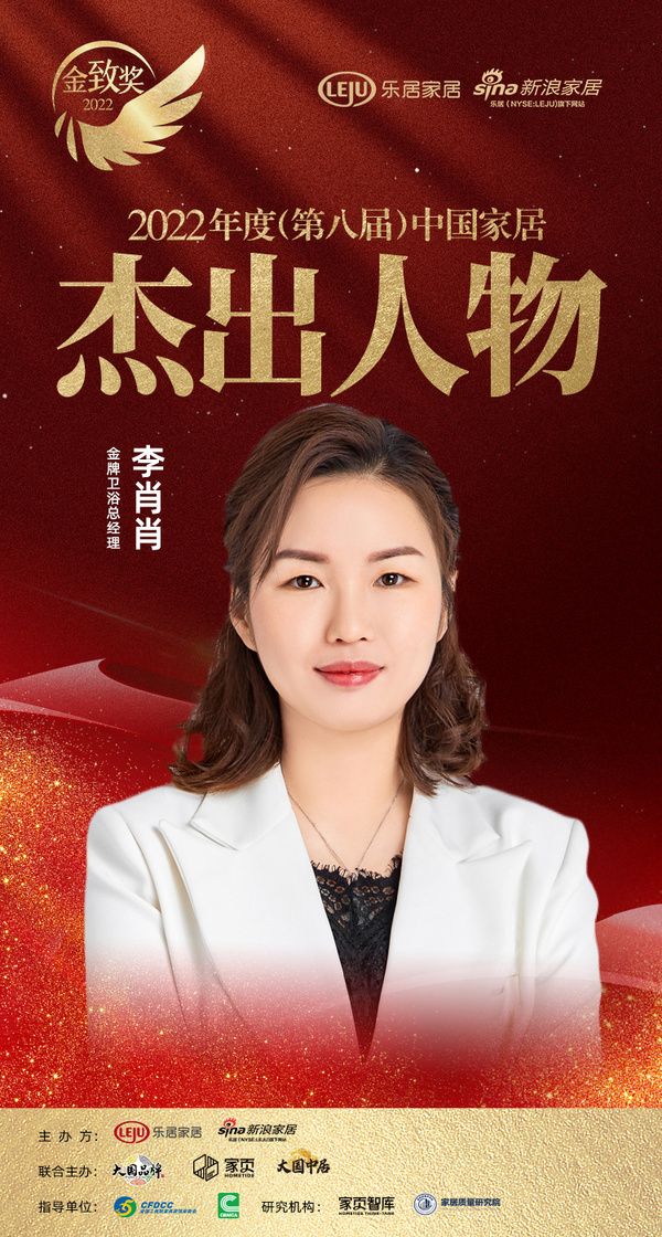 2022年12月26日,『趁势·再起——2022中国家居新时代盛典暨金致奖颁奖典礼』在云端盛大举行。金牌卫浴李肖肖荣获「2022(第八届)中国家居杰出人物」称号。