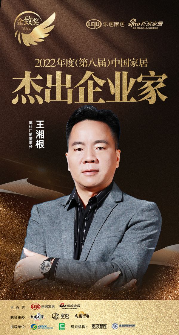 新浪家居讯 由乐居家居主办,新浪家居承办,大国品牌、家页智库、大国中居联合主办的『趁势·再起——2022中国家居新时代盛典暨金致奖颁奖典礼』于12月26日在云端盛大开幕。博仕门窗董事长 王湘根荣获「2022年度(第八届)中国家居杰出企业家」称号。