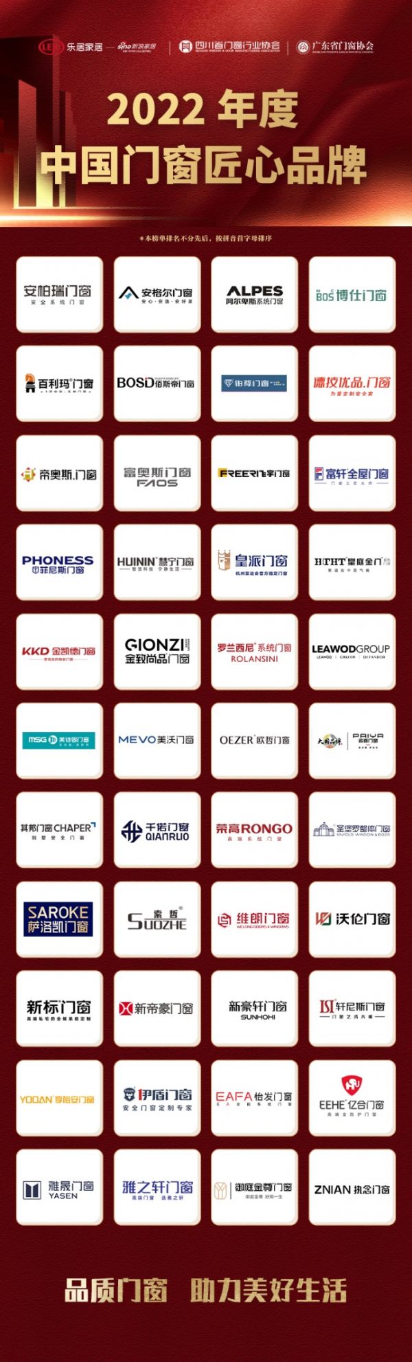 在品质门窗助力美好生活颁奖环节中,安柏瑞安全系统门窗、安格尔门窗、阿尔卑斯系统门窗、博仕门窗、百利玛门窗、佰斯帝门窗、铂尊门窗、德技优品门窗、帝奥斯门窗、富奥斯门窗、飞宇门窗、富轩全屋门窗、菲尼斯门窗、慧宁门窗、皇派门窗、皇庭金门系统门窗、金凯德门窗、金致尚品门窗、罗兰西尼系统门窗、良木道、美诗固门窗、美沃门窗、欧哲门窗、派雅门窗、其邦门窗、千偌门窗、荣高门窗、圣堡罗整体门窗、萨洛凯门窗、索哲门窗、维朗门窗、沃伦门窗、新标门窗、新帝豪门窗、新豪轩门窗、轩尼斯门窗、享裕安门窗、伊盾门窗、怡发门窗、亿合门窗、雅晟门窗、雅之轩门窗等品牌获得“2022中国门窗匠心品牌”,御庭金尊门窗、执念门窗获得“2022中国西南门窗智造品牌”称号。