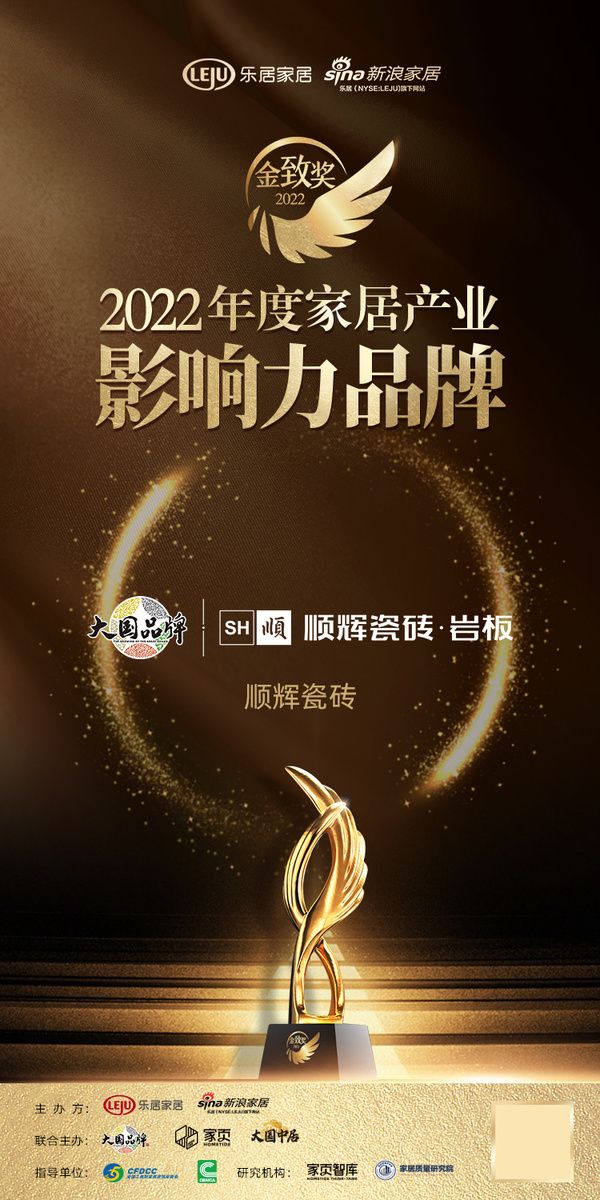 2022年12月26日,『趁势·再起——2022中国家居新时代盛典暨金致奖颁奖典礼』在云端盛大举行。顺辉瓷砖.岩板荣获「2022年度中国家居影响力品牌」称号。