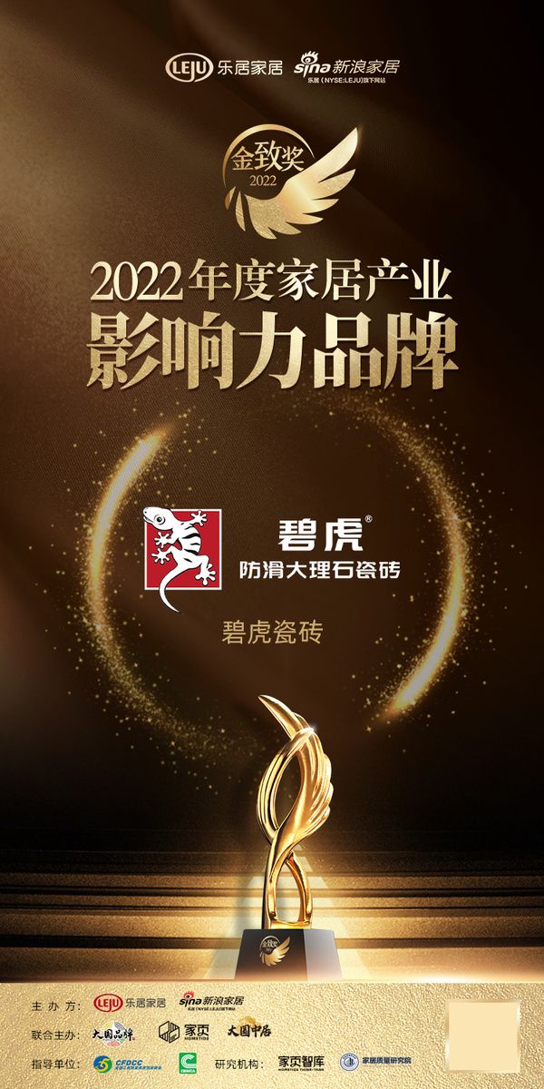 2022年12月26日,『趁势·再起——2022中国家居新时代盛典暨金致奖颁奖典礼』在云端盛大举行。碧虎防滑大理石瓷砖荣获「2022年度中国家居影响力品牌」称号。