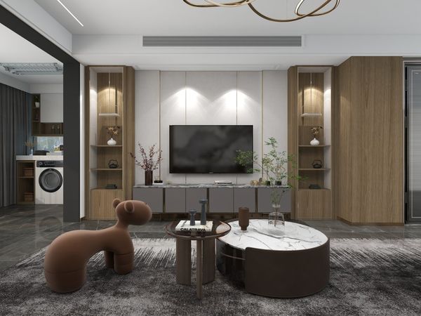 客厅的电视背景墙采用的是对称式的设计。奥华设计师以黄栗柚、月牙白互相搭配。用简洁的线条感营造出“轻”的氛围,虽然以简洁为主但并不随意,用简单利落的线条及统一的配色完成整体设计。