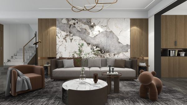 沙发背景墙运用奥华石晶壁画、黄栗柚搭配。在看似自然朴素的外表下隐藏着贵族的气质。
