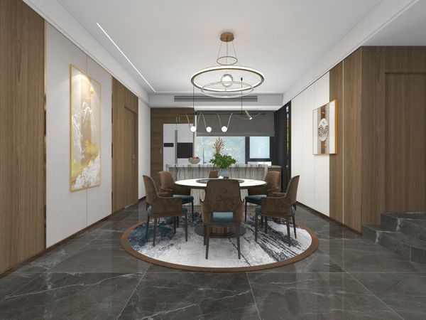 餐厅的设计同样也是非常的轻奢简约。延续了客厅的设计风格,让轻奢风格拥有奢的高冷,但也多了一些生活的烟火气和温度。