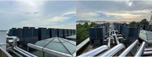 项目确定后,中广欧特斯当地团队根据酒店的实际需求量以及建筑情况,决定为总供暖面积八万㎡的酒店配备了16台50HP的热泵风冷模块机组,保留原有的采暖末端,并为400多个房间配备了4台60HP热泵热水机组,集中安装在酒店辅楼天台上,以专业高效的采暖及热水解决方案,为入住宾客提供更好的居住环境。
