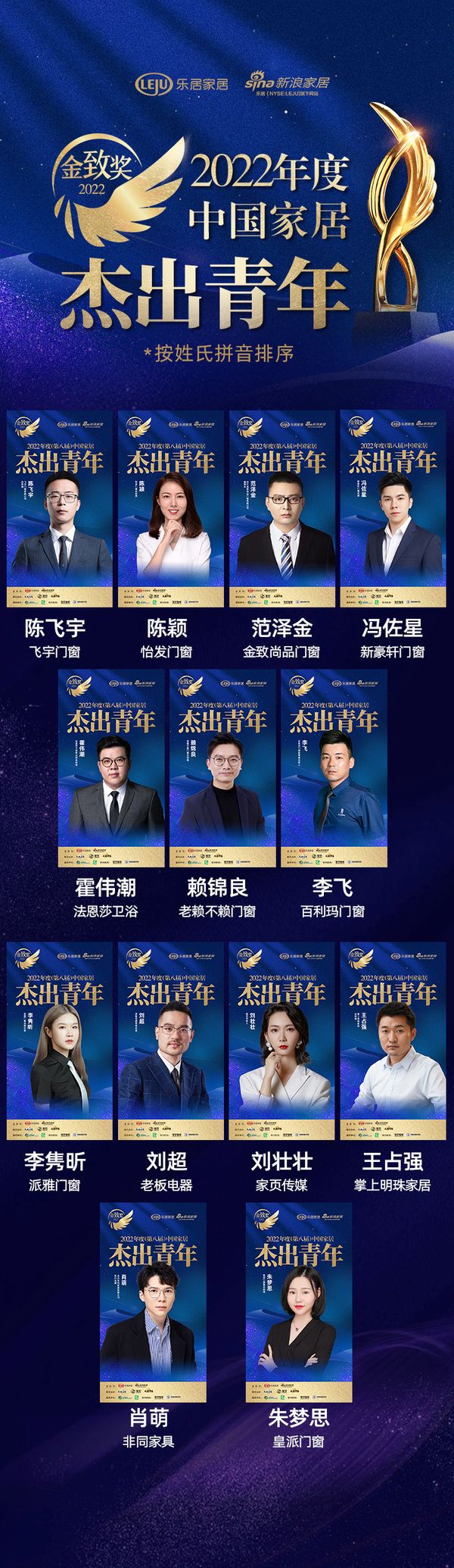 盛典当日,大会揭晓了《2022年度(第八届)中国家居杰出青年》获奖名单。分别是:飞宇门窗 陈飞宇;怡发门窗 陈颖;金致尚品门窗 范泽金;新豪轩门窗 冯佐星;法恩莎卫浴 霍伟潮;老赖不赖门窗 赖锦良;百利玛门窗 李飞;派雅门窗 李隽昕;老板电器 刘超;家页传媒 刘壮壮;掌上明珠家居 王占强;非同家具 肖萌;皇派门窗 朱梦思。
