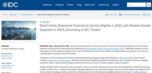 智能家居快讯|IDC报告:2022年全球智能家居设备的出货量将下降,预计2023年恢复增长