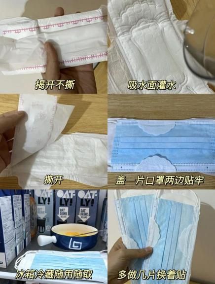 我们可以将姨妈巾的吸水面灌上水,然后将其贴在口罩上,冰箱冷藏随用随取,非常方便,多准备上几个,就不用因为买不到退热贴而发愁啦。