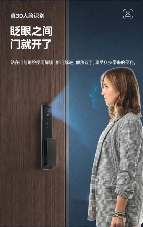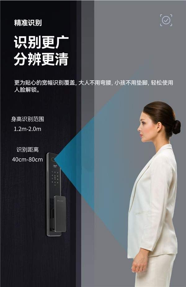超广角高清摄像头带来的拍摄能力,识别覆盖范围更广,身高识别范围由1.2m到2.0m,大人不用弯腰,小孩不用垫脚,站在门前刷脸便可精准识别人脸轻松解锁;分辨率更清晰,清楚地看到门外有人经过的情况,对门外情况一目了然,时刻掌握家门安全。