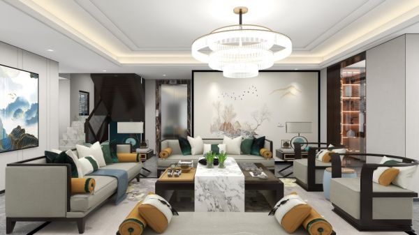 新中式在色彩运用上更多采用浅灰、自然木色等搭配,营造出清淡典雅的古韵。同时,遵循传统中华审美中的“对称”原则,大多数新中式的客厅会呈现一种左右对称之美。