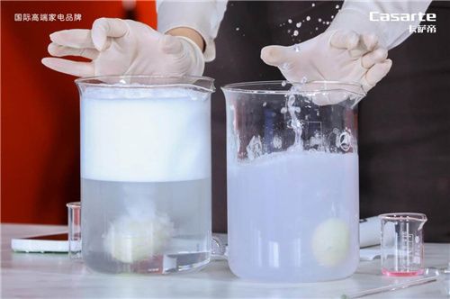 鸡蛋落水测试中,卡萨帝羊毛真丝湿洗乳液中能够出现更多绵密细泡,对鸡蛋起到了缓冲作用,鸡蛋从齐平烧杯口落入也没有出现任何裂痕。而落入普通洗涤剂中的鸡蛋则会因为没有缓冲而破损。