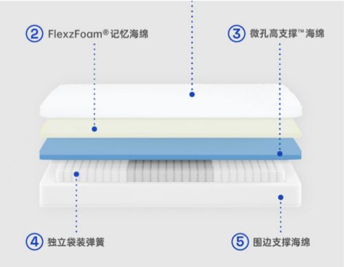 想要观察一款床垫产品,是否真的舒适,真的能够提升睡眠质量,首先要聚焦于“产品结构”。蓝盒子Z1床垫采用了5层结构,层层递进,包括天丝品牌纤维外套、记忆绵、微孔高支撑海绵,以及独立袋装弹簧和围边支撑海绵,进一步提高舒适度,为消费者带来不错的睡眠体验。