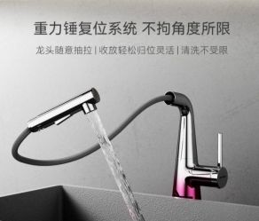 凭借内置的重力锤复位系统,升降抽拉面盆龙头有效增强软管向下牵引力,确保抽拉龙头使用后,快速准确复位。同时龙头出水不受传统固定结构束缚,台面与面盆的清洁死角也能轻松冲洗。