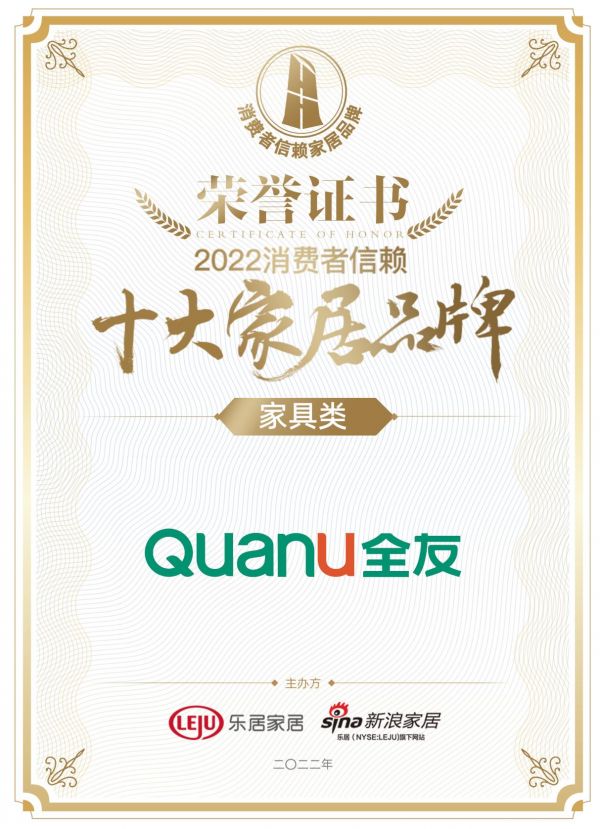 近日,由乐居家居主办,新浪家居承办,CCTV《大国品牌》、家居质量研究院等单位联合主办的“2022消费者信赖十大家居品牌”评选活动圆满结束,全友家居凭借过硬的品牌实力、优质的产品与良好的服务口碑,荣获“2022消费者信赖十大家居品牌”称号。