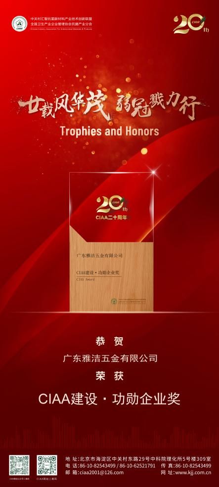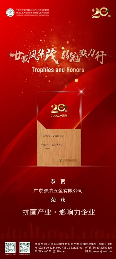2022年12月25日,雅洁五金受邀参与CIAA成立20周年纪念会暨总结表彰大会,受疫情影响,大会以在线形式举行。大会在发布CIAA二十周年大事记基础上,重点对CIAA建设和抗菌产业发展做出突出贡献的单位和个人进行了表彰。雅洁五金在抗菌事业上尽心尽责,全力以赴,获得CIAA协会与行业的高度褒奖。