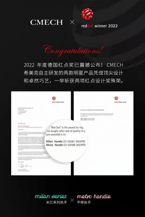 凭借在产品细节上精益求精的品质追求和不断探索创新的精神,CMECH希美克在门窗五金领域也获得累累硕果,多项产品获得国际专利证书,其研发的执手、铰链等产品更相继获得德国红点奖、红棉奖、北极星奖等多个行业权威创新设计奖项,奖项让更多人了解到了CMECH希美克门窗五金品质,也推动了CMECH希美克品牌在国内门窗行业及市场的开拓。
