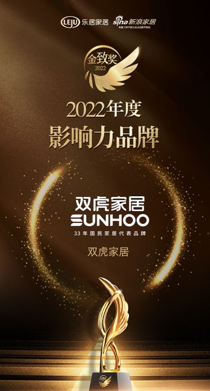 2022年12月26日,由乐居家居主办,新浪家居承办,CCTV《大国品牌》、家页智库、大国中居协会联合主办的『趁势·再起——2022中国家居新时代盛典暨金致奖颁奖典礼』在云端盛大举行,双虎家居荣获“2022年度中国家居影响力品牌”称号。