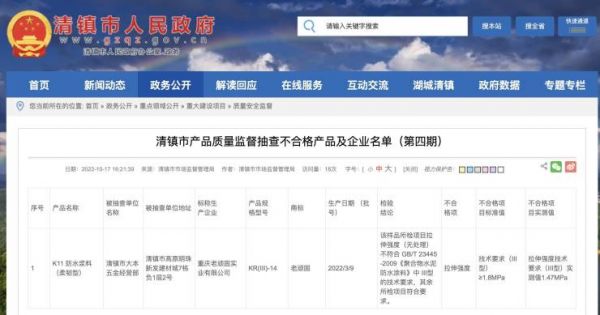为了给消费者带来更安心的消费体验,同时规范市场秩序,国家及各省市级市场监督管理局一直持续对市场上在售的防水产品进行定期抽检。近日,经过对各政府官网公示的防水产品抽检情况进行盘点,发现由“重庆尚久实业有限公司”生产的“尚九”品牌防水浆料、“重庆老顽固实业有限公司 ”生产的“老顽固”品牌防水浆料以及“佛山市耐高建材有限公司”生产的“佳阳水卫士”品牌防水涂料存在不同程度的抽检不合格情况。