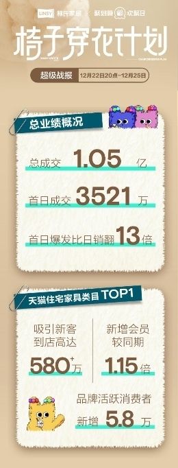 从林氏家居公布的战报获悉,自12月22日20点活动之始到12月25日,林氏家居总成交额达1.05亿,首日成交额达3521万,首日爆发比日销售额翻13倍,吸引新客到店高达580+万,新增会员教同期增长1.15倍,品牌活跃消费者新增5.8万。