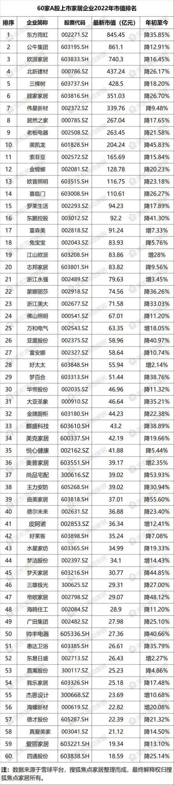 60家A股家居企业2022市值表现