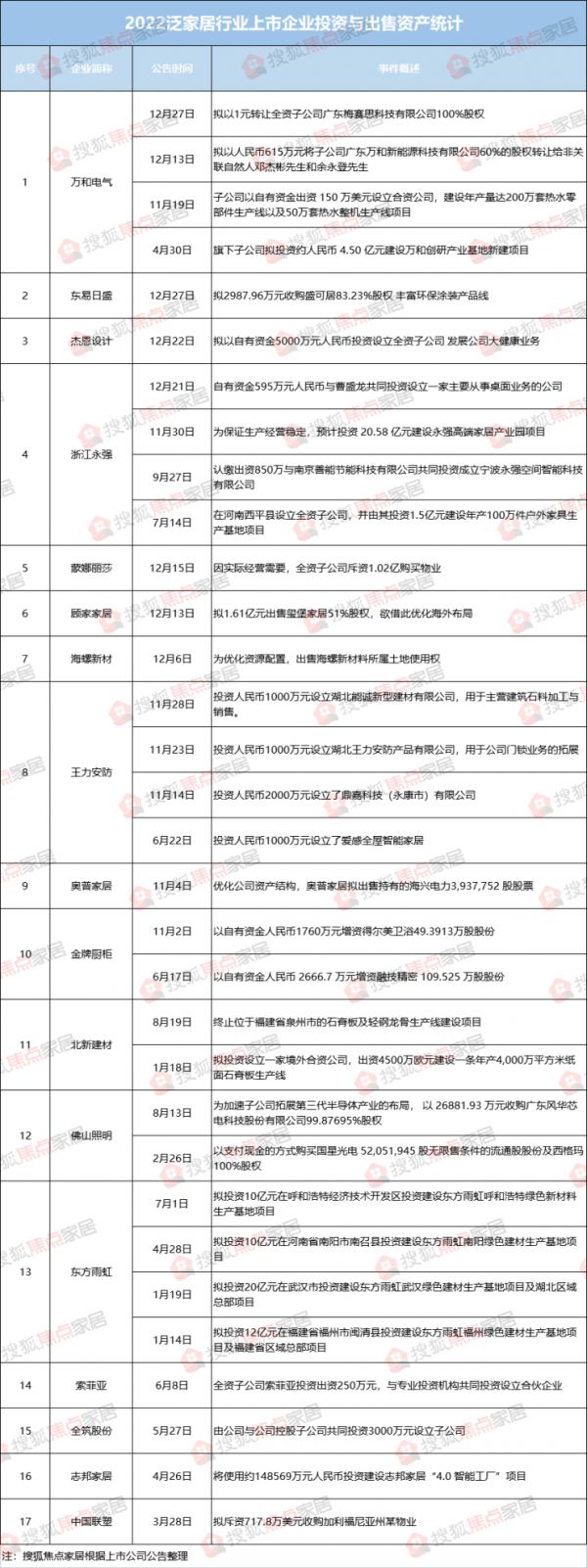 众所周知,2022年的泛家居建材行业走得十分艰难。一方面,是广阔的万亿市场,另一方面,却是前仆后继的悲壮景象。为了企业的更好发展,优化产业结构,许多上市家居企业通过增产、投资、扩网、出售资产等方式来进行调整。据搜狐焦点家居不完全统计,2022年共有17家企业共计32起相关公告。