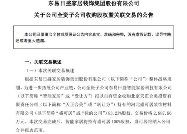 2022年12月27日,东易日盛(002713.SZ)公告称,为进一步拓展公司产业链,公司全资子公司东易日盛智能家居科技有限公司拟以自有资金收购北京天正合美投资有限责任公司持有的河北盛可居装饰材料有限公司(以下简称“盛可居”)83.23%股权,交易价格 2,987.96万元。