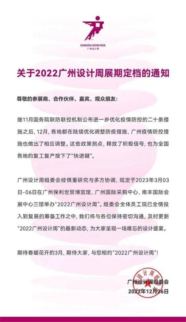 12月26日,广州设计周组委会发布2022年广州设计周展期定档通知,原定于2022年12月9日—12日举办的广州设计周延期至2023年3月3日—6日在广州保利世贸博览馆、广州国际采购中心、南丰国际会展中心三馆举办。
