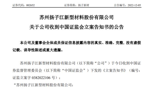 扬子新材遭中国证监会立案调查