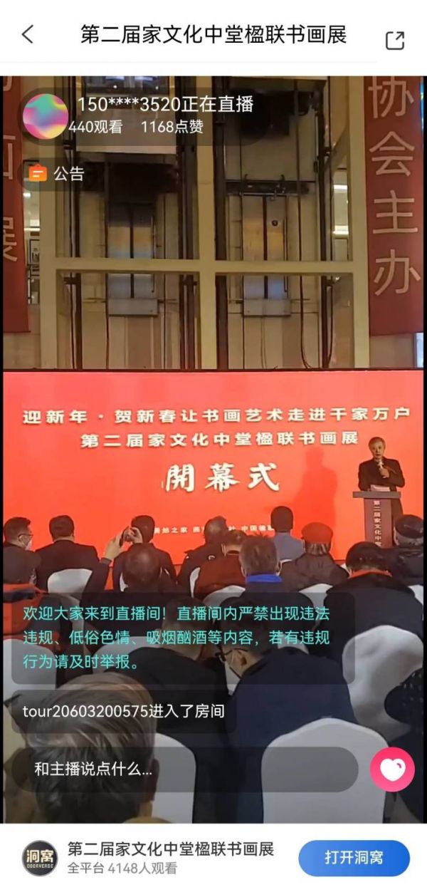 除了四大会场联动之外,此次活动还创新了传播方式,采用“线上直播+线下书写”的形式。线上,通过燕京书画2个抖音号直播+居然之家自主研发的数字化产业服务平台“洞窝”现场同步直播并进行书画线上出售,体现了传统文化与现代科学技术的完美结合,展现了更加年轻化的书画艺术,为现场和手机前的观众带来一次新春同乐机会,延伸欢乐氛围。