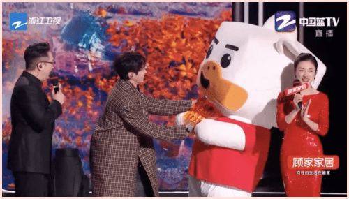 除了把产品搬上了舞台,在晚会现场,顾家家居的品牌元素更是无处不在,用一道道“顾家红”强势吸睛。顾家家居的吉祥物顾家牛牛还化身幸运大使,为多位明星送上特别定制的联名款潮流盲盒,在这个充满青春活力的舞台上,以年轻人喜爱的形式,送上对新一年美好向往的祝福。