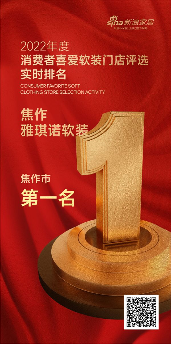 此次评选中,焦作雅琪诺软装凭借一以贯之的周到服务、物超所值的产品选择、相得益彰的个性化推荐等优质口碑,荣获《2022年度消费者喜爱软装门店评选》焦作市第一名。
