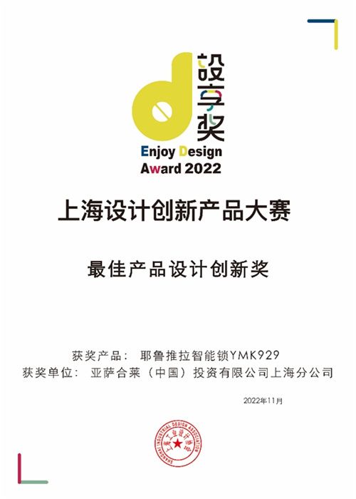 自2017年发起的“设享奖EDW”上海设计创新产品大赛,在工业设计领域有“上海名片”之美誉。本届大赛聚焦“设计·生活·分享”为主题,设置了“衣、食、住、行、养、用”六大参赛类别,于2022年7月启动,征集到来自全国各地设计单位、设计类院校及独立设计师们的创意作品1000多件。最终,146件作品入围,经过专家评选等环节,评选出获奖作品50件,其中18个最佳产品设计创新奖。耶鲁智能锁新品YMK929凭借出色的外观设计和实用的安全性能赢得了评委会的高度认可,成功赢得最佳设计创新奖!