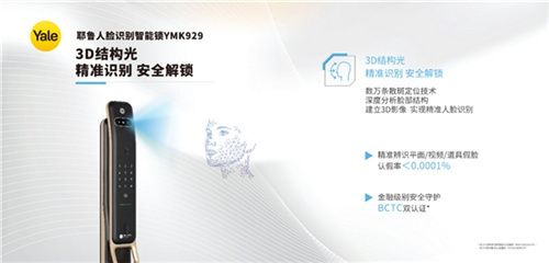 180多年来,耶鲁秉持“不断推进可信赖的创新”的品牌精神,致力于精益求精的工艺与安全品质。Yale耶鲁YMK929采用创新的3D结构光设计,具有3万多光点投影,可构造立体人脸影像,让智能锁可以轻松排除妆容影响,精准识别真假人脸,认假率小于0.000001。这项3D人脸模组识别技术同时获得了BCTC(国家金融测评中心、银行卡检测中心)双认证,能够为生活带来金融支付级别的安全守护。