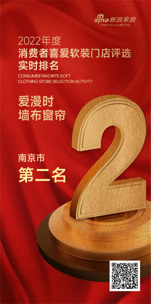 此次评选中,爱漫时墙布窗帘凭借精益求精的周到服务、多元的优质产品、极具美学的独家定制等优质口碑,荣获《2022年度消费者喜爱软装门店评选》江苏省第二名。