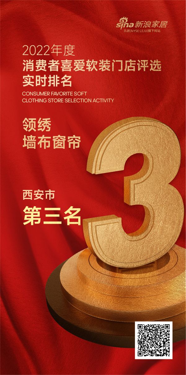 此次评选中,领绣墙布窗帘凭借精益求精的周到服务、多元的优质产品、极具美学的独家定制等优质口碑,荣获《2022年度消费者喜爱软装门店评选》西安市第三名。