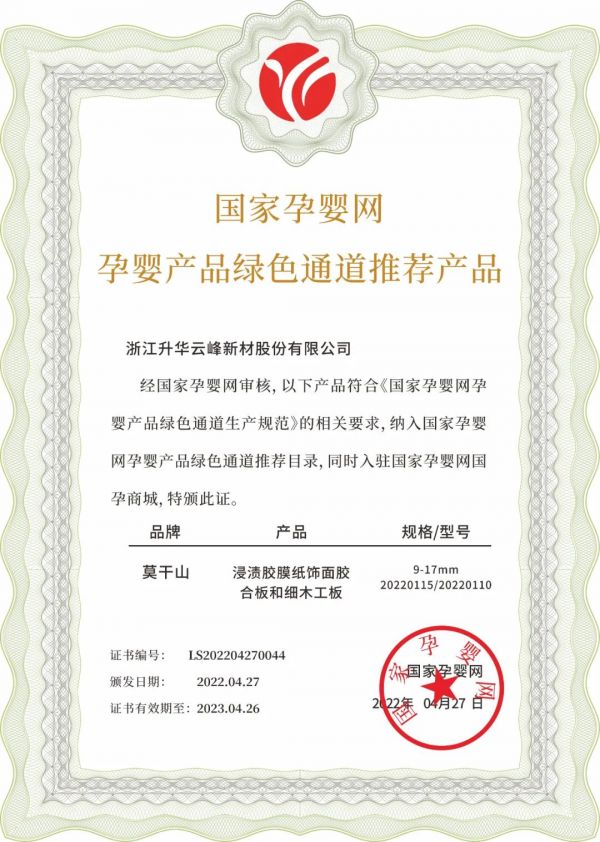 2022年,在豆茵板基础上,莫干山板材推出了抗菌抗病毒的生态板,通过分子巢等黑科技,将板蓝根、甘草、金银花等抗菌抗病毒的中草药精华加入表面胶膜纸中,在实验室环境中,这款生态板对流感病毒、肠道致病菌、金黄色葡萄球菌、大肠杆菌等常见致病菌和病毒可以实现99%以上的杀灭率。即便家里有喜欢探索世界的孩子,也不用太过担心因为接触致病菌而导致身体不舒服啦!而且,莫干山的豆茵板全系列产品还被正式纳入国家孕婴产品绿色通道目录,获得了“国家孕婴网入网推荐证书”,宝妈奶爸们可以放心选用。