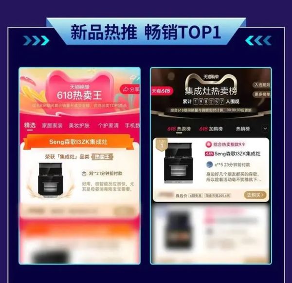 随后,i3zk自淘宝女王节亮相之后,凭借40项硬核黑科技一路开挂,掀起阵阵销售热潮。淘宝女王节期间,预售1小时破800万,天猫月销订单轻松1000+;4.22超级品牌日,i3zk延续女王级首发预售第一、首发月售2000台的火爆势头,占据天猫单品第一、行业第一、店铺第一、热销榜第一等多个冠军宝座;618预售期间,狂揽大牌家电TOP1、集成灶预售榜TOP1。