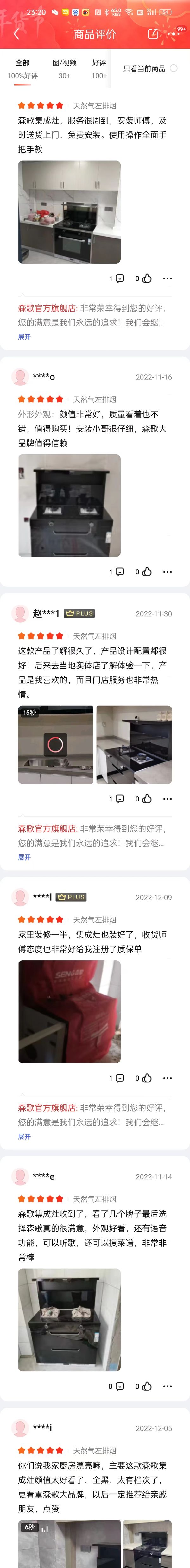 京东平台森歌i5系列集成灶的售后评价也是100%好评。