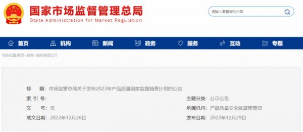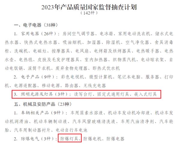近日,国家市场监督管理总局发布《2023年产品质量国家监督抽查计划的公告》,包括电子电器、耐用消费品、电工及材料产品等142种产品。其中,涉及读写台灯、固定式通用灯具、嵌入式灯具、防爆灯具等4种照明相关产品。